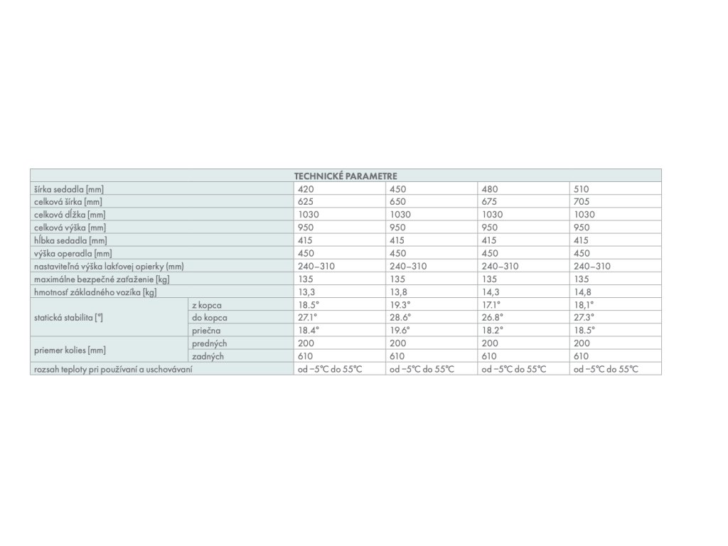 - hmotnosť základného vozíka: 13,3 - 14,8 kg