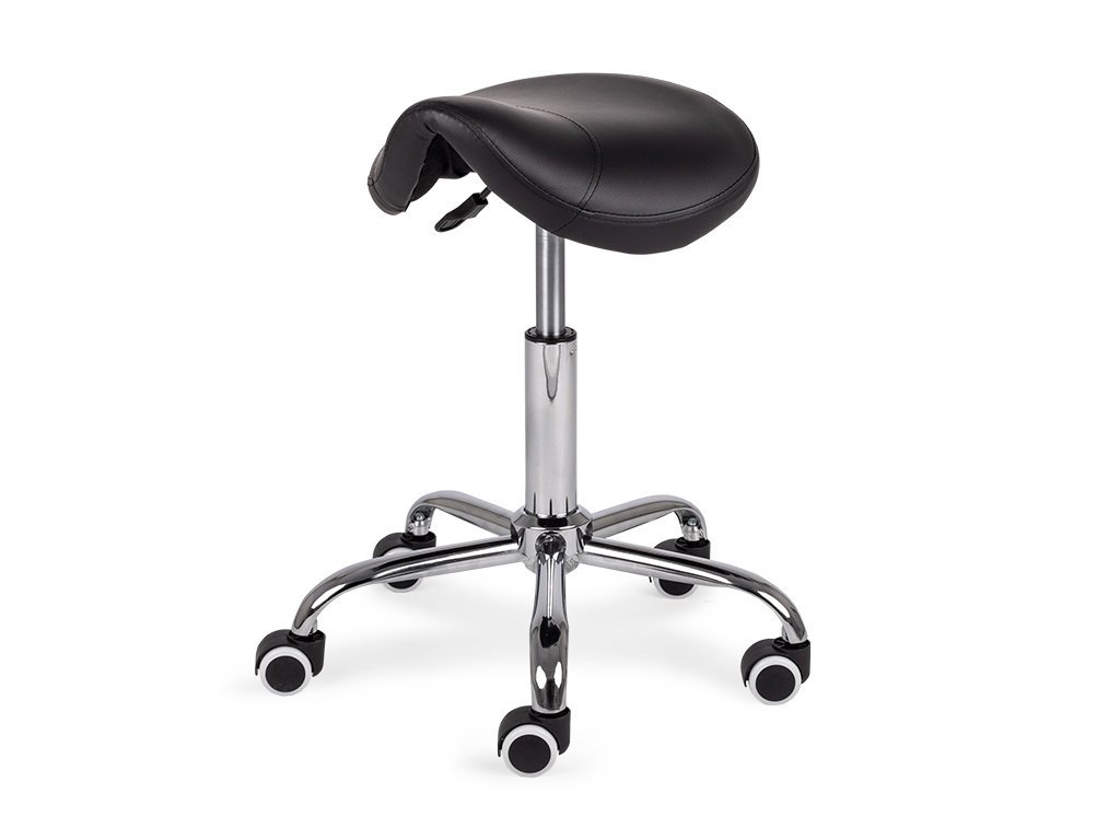Ergonomická otočná stolička s profilovaným sedadlom v tvare sedla, pohodlným nastavením výšky pomocou plynovej pružiny a koliesok. Sedlová stolička podporuje optimálne rozloženie telesnej hmotnosti a uľahčuje zaujatie prirodzenej polohy v sede. Päťramenný, lesklý chrómový podstavec dodá eleganciu každému interiéru. Určené pre masážne salóny, fyzioterapiu, kozmetické a kadernícke salóny.