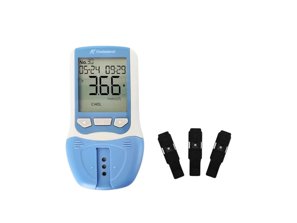 Cholesterolmeter je určený na kvantitatívne stanovenie koncentrácie celkového cholesterolu (CHOL), cholesterolu s vysokou hustotou lipoproteínov (HDL) a triglyceridov (TRIG) v plnej ľudskej krvi (žilová a kapilárna krv), séra a plazme a na odhad pacientov s rizikom ischemickej choroby. Keď je vzorka plnej krvi pridaná do oblasti vzorky cholesterolu Testovací prúžok: počas procesu rovnomernej a rýchle infiltrácie sú krvinky odfiltrované a plazma sa rozprestrie do reakčnej vrstvy. Potom, čo test reaguje s enzýmami a chemikáliami v reakčnej vrstve, sa reakčná vrstva sfarbí na modro, čo je úmerné koncentrácii testovaných analytov. Ak sa do oblasti testovanej vzorky pridá vzorka plazmy a séra, vzorka sa priamo rozprestrie do reakčnej vrstvy a začne sa reakcia, bez procesu filtrácie krviniek. Merač cholesterolu (metóda optickej chémie) detekuje intenzitu farby reakcie končiacej na vlnovej dĺžke 635 nm a pomocou reflexného koeficientu vypočítava koncentráciu celkového cholesterolu (CHOL), cholesterolu s vysokou hustotou lipoproteínov (HDL) alebo triglyceridov (TRI) prúžku na cholesterol.